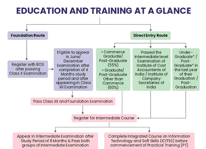 - If you are through Direct Entry scheme i.e., you are a commerce Graduate/Post-Graduate (with minimum 55% marks) or Non commerce Graduate/Post-Graduate (with minimum 60% marks) or you are an Intermediate level passed candidates of Institute of Company Secretaries of India or Institute of Cost Accountants of India.