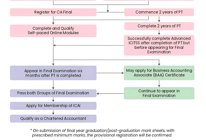 - After completion of the practical training but before appearing for the CA final examination, candidates also have to undergo an Advanced Integrated Course on Information Technology and Soft Skills(AICITSS)